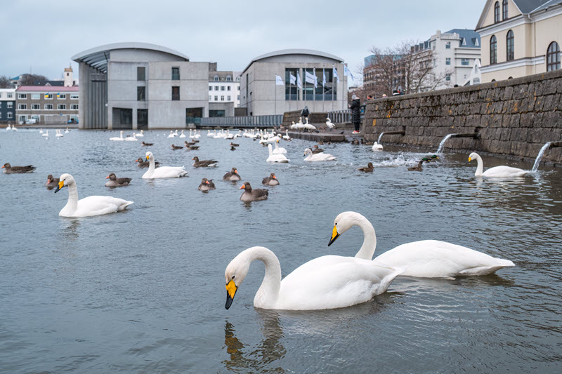 * City hall - 시청외부관광과 백조와 오리들이 방문하는 Tjornin 호수 관광