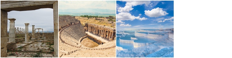 호텔 조식 후 목화의 성이라 불리는 성서상의 히에라 볼리인 파묵칼레로 이동하여 라오디게아와 고대 히에라볼리 유적 및 노천온천의 경관을 관광 후온천 호텔 투숙. (온천시 수영복 지참 필수) [조] 호텔식 [중] 현지식 [석] 호텔식 HTL : PAM THERMAL 혹은 5성 동급 호텔
